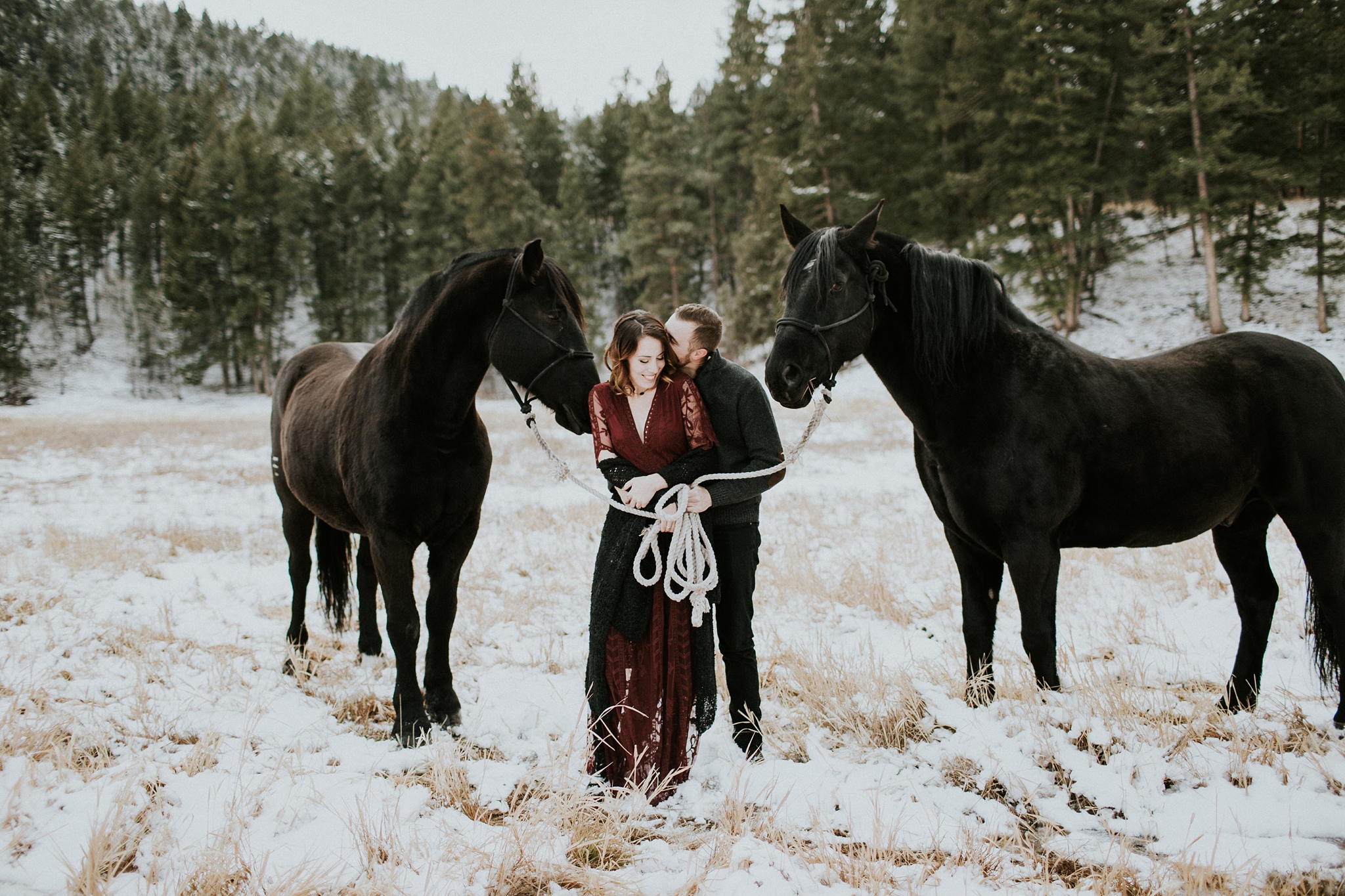 We planned this fall engagement session and ending at this beautiful little knoll in the mountains at sunset. Montana had other plans and it was more like winter but we didn’t care. Andy’s mother has this incredible property outside Missoula and we went out there and took a couple horses out for a bit. They were HILARIOUS always trying to get their little nudges in. It couldn’t have been more perfect with mountain views, black horses, her maroon dress and some snow on the ground.